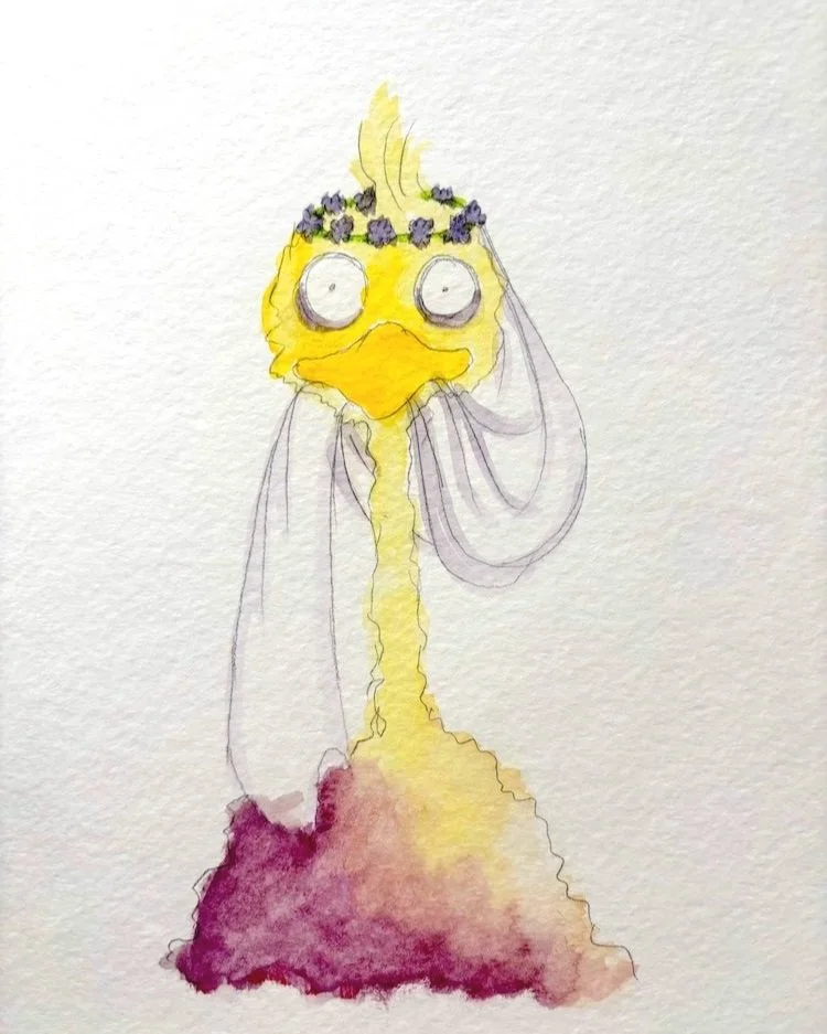 Throughout the years I continued exploring my style, heavily influenced by Shel Silverstein, Quentin Blake, Tim Burton, Mathew Gray Gubler, Lynn Johnston, and Bill Waterson to name a few. In high school, I painted these watercolour ostrich paintings, my anxious flightless fowl, whose loose lines and use of colour would become central to my art.
